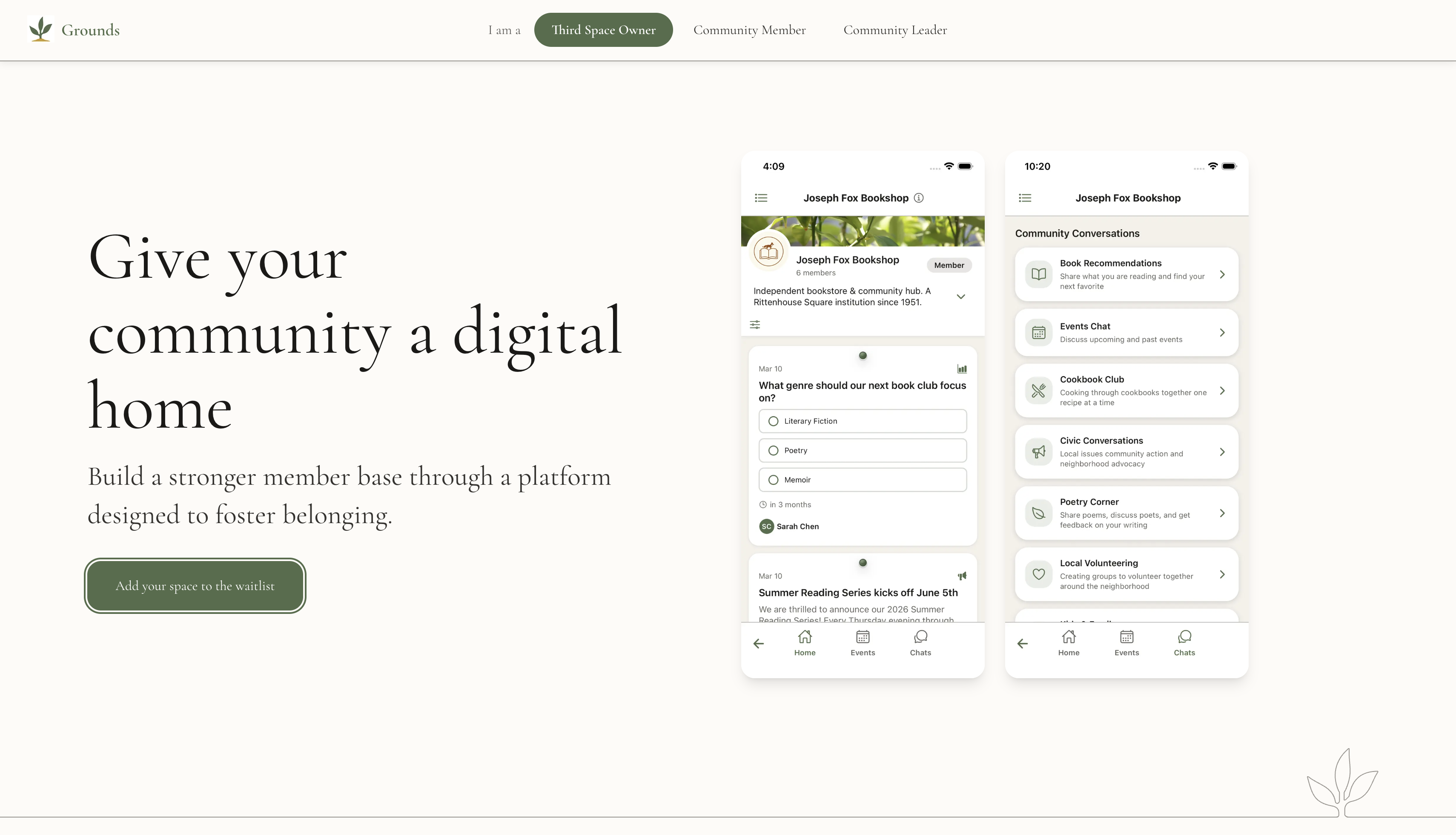 After getting feedback on a few proof-of-concept product ideas, I settled on Grounds, a platform that gives third space businesses a "digital home" designed to build stronger member bases. These spaces could be your local coffeeshop, library, or art space that holds gatherings. I built the first version of this product over the course of the first months of 2026.
